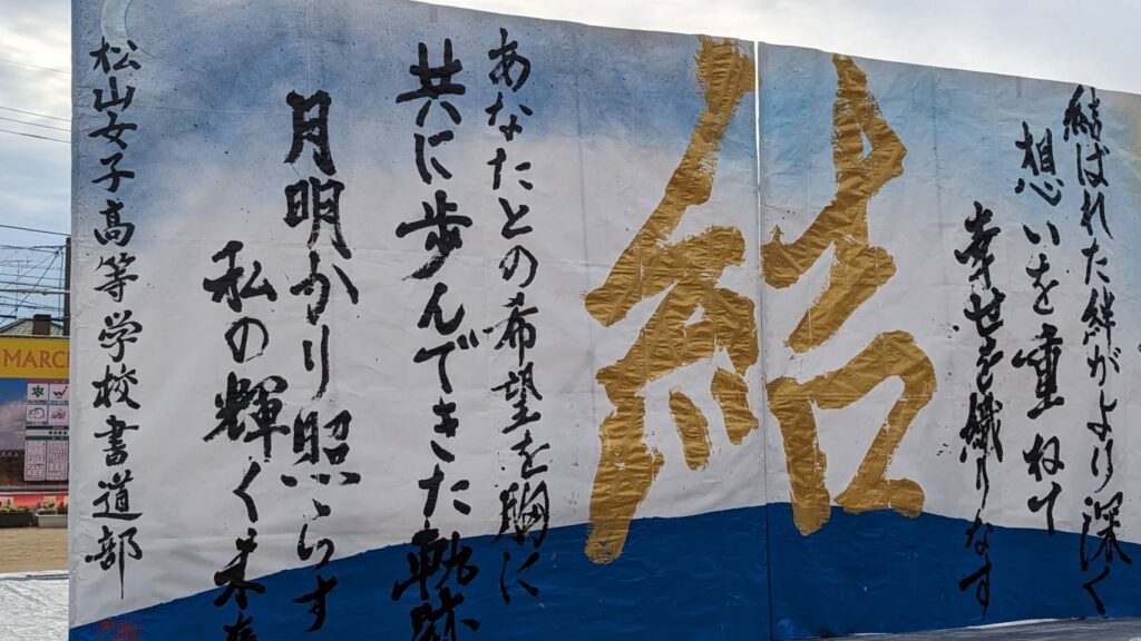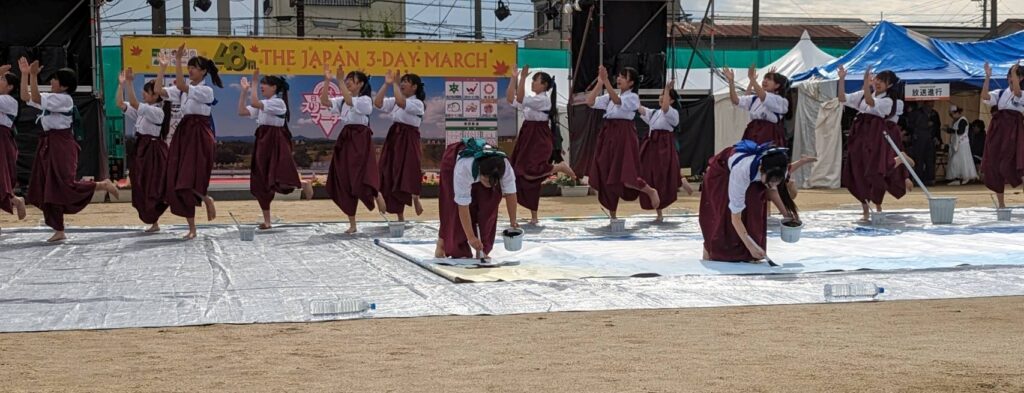 11月2日、第48回日本スリーデーマーチの中央会場(東松山市立第一小学校)で、松女書道部がパフォーマンスを披露し、明るく元気な演技で、地元が誇る行事の盛り上げに一役買っていました。盛大な拍手に笑顔で応えた書道部の皆さんも、大きなエネルギーをいただいたようでした。